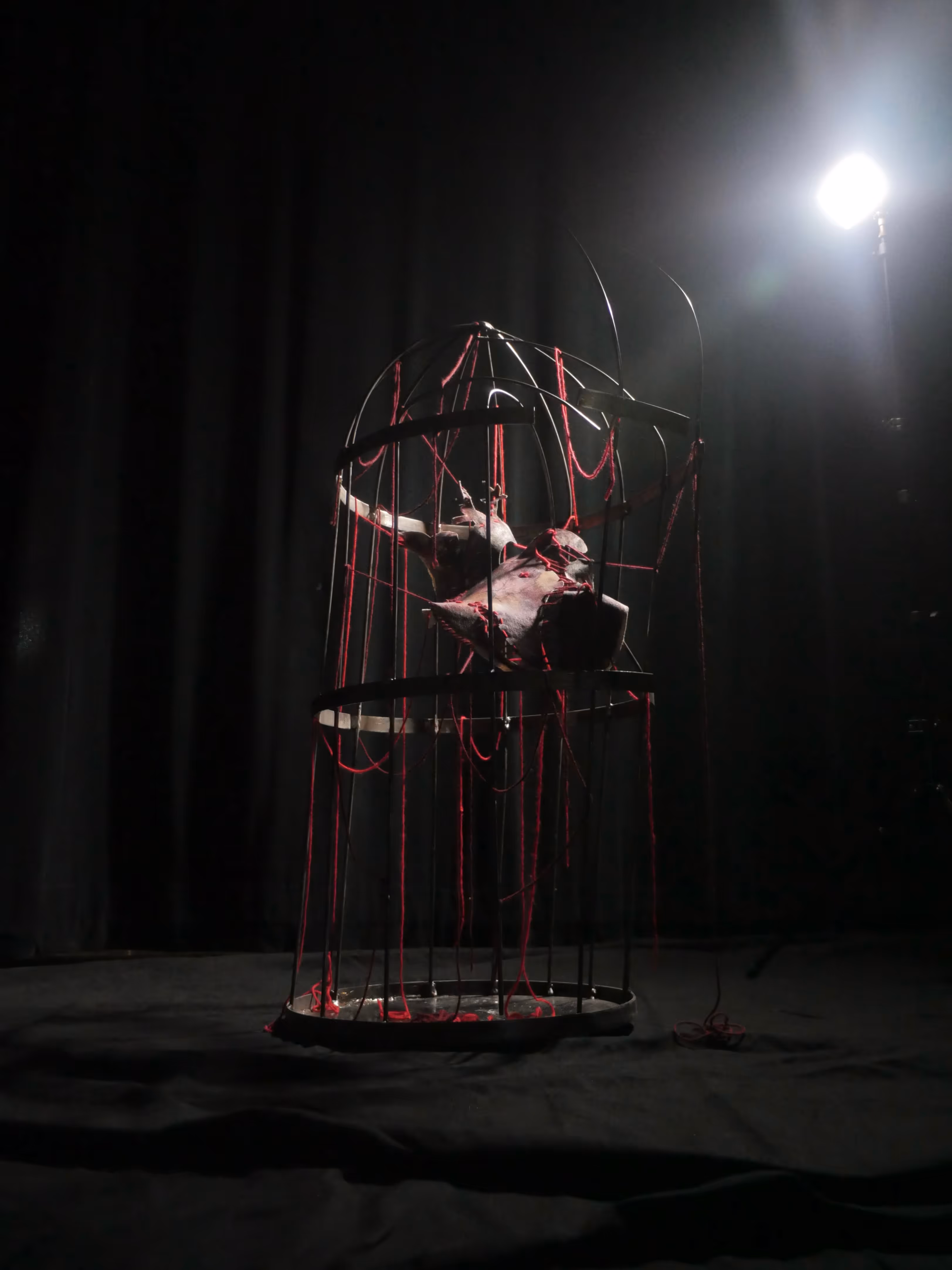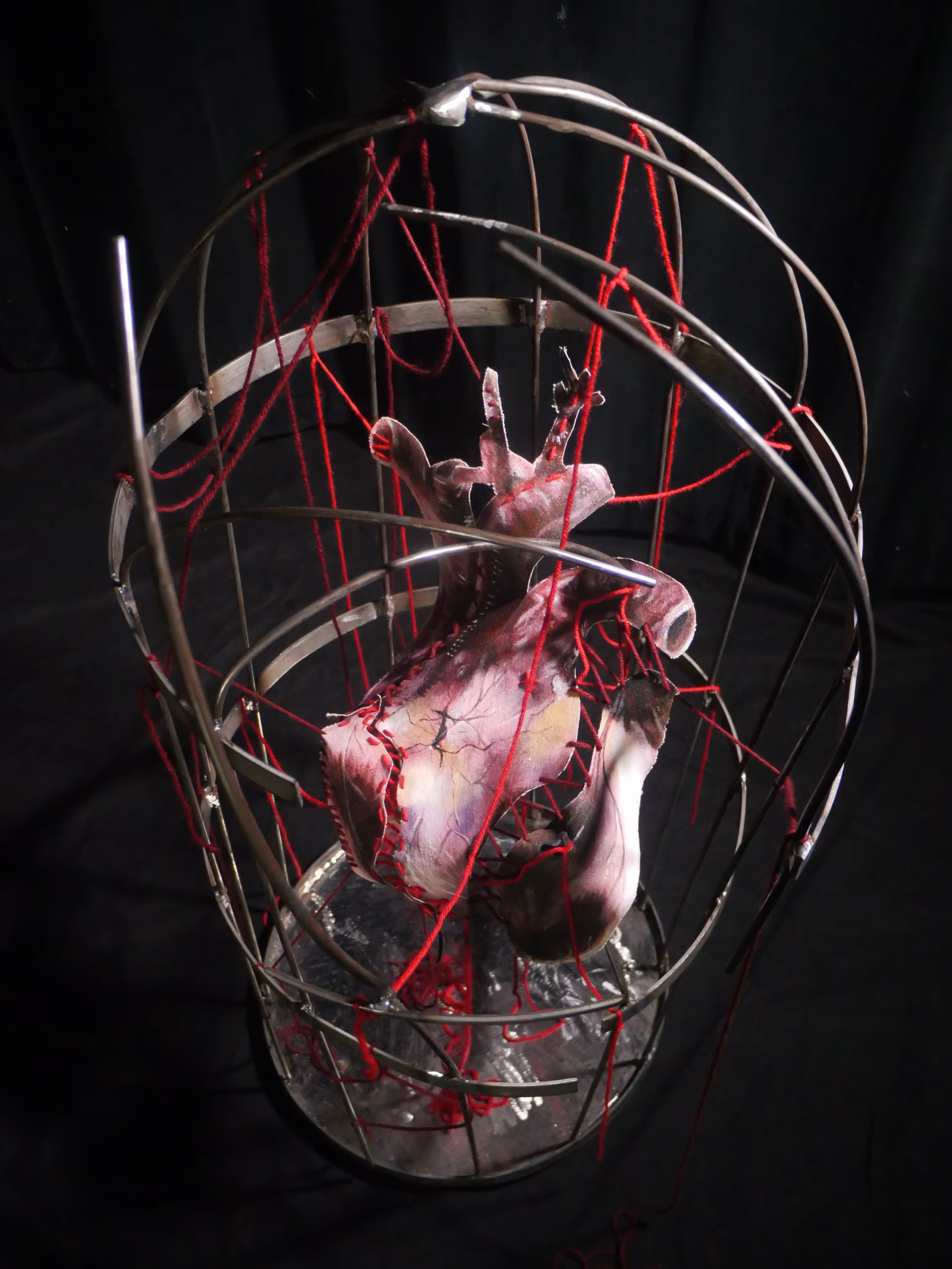 The anguish of making a difficult decision, represented by a painted heart distorted into three dimensions, suspended in a welded cage.