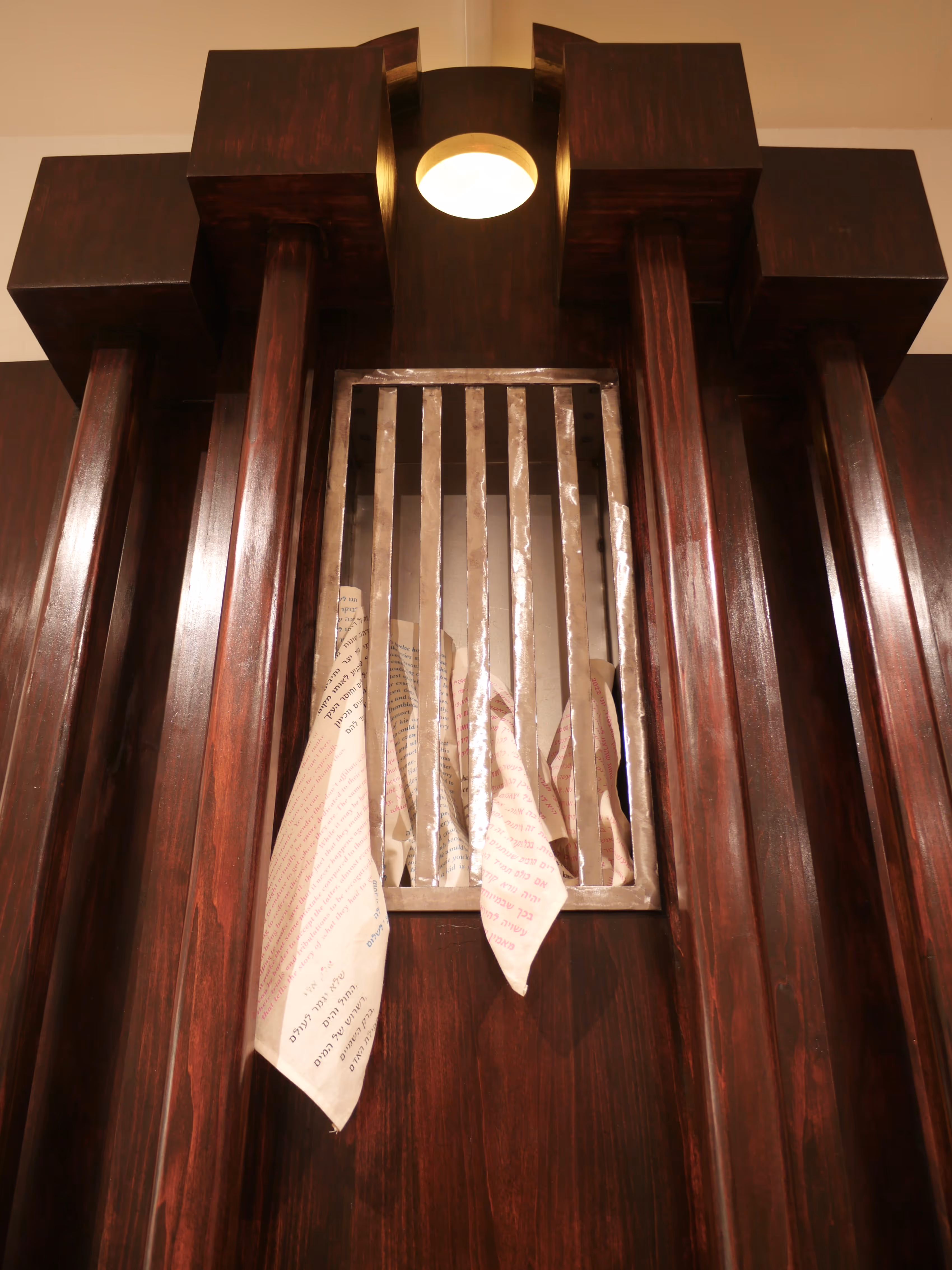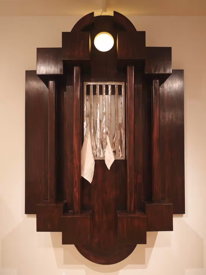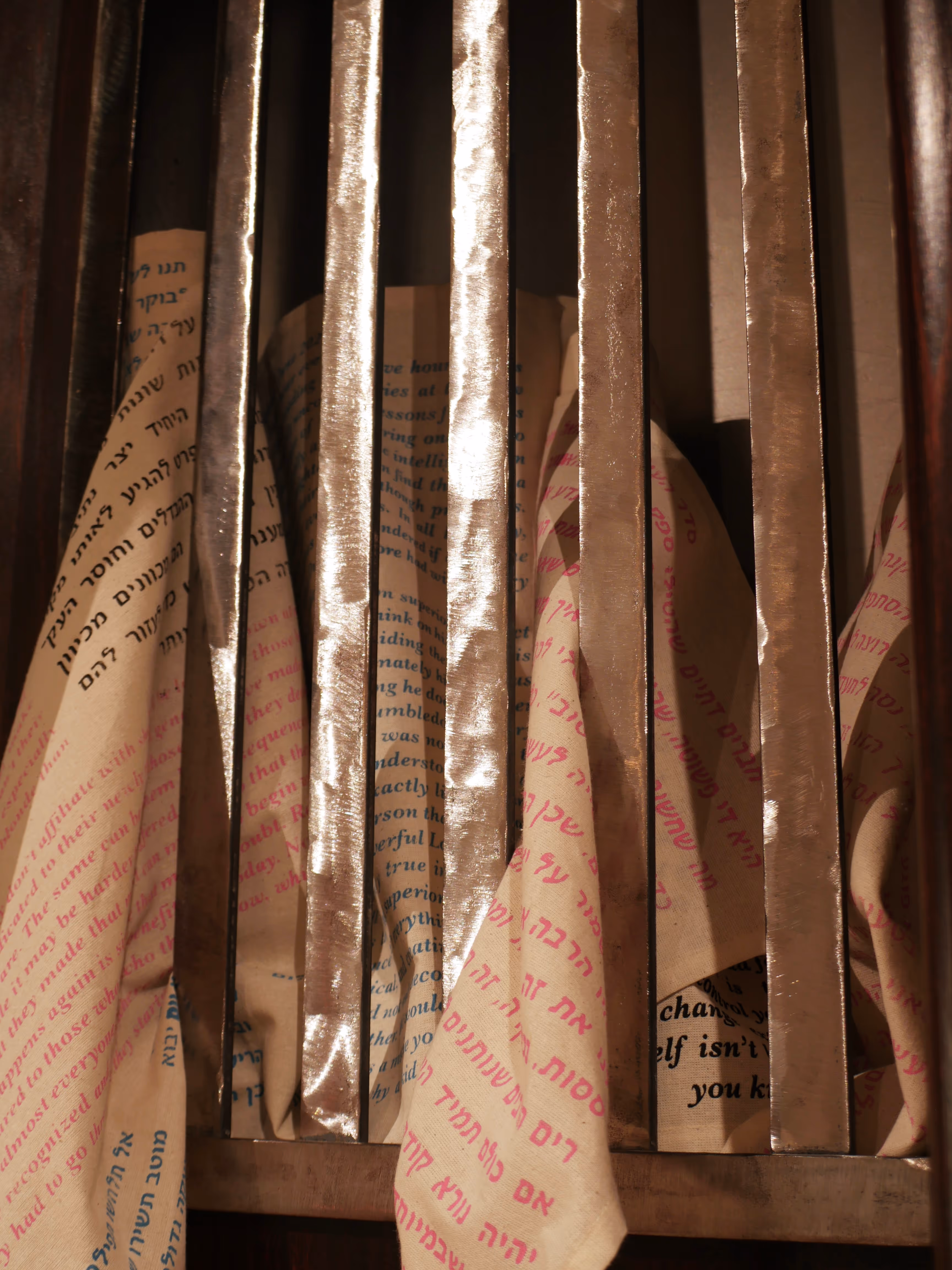 This closet is a solid and imposing facade of steel and wood shaped by generations of tradition that harbors and hides the amalgamation of defining beliefs and values, both aligned and in conflict with the Jewish and Queer communities. But as solid as the closet needs to be, the tighter the core of this person is restrained, the more they yearn for release.