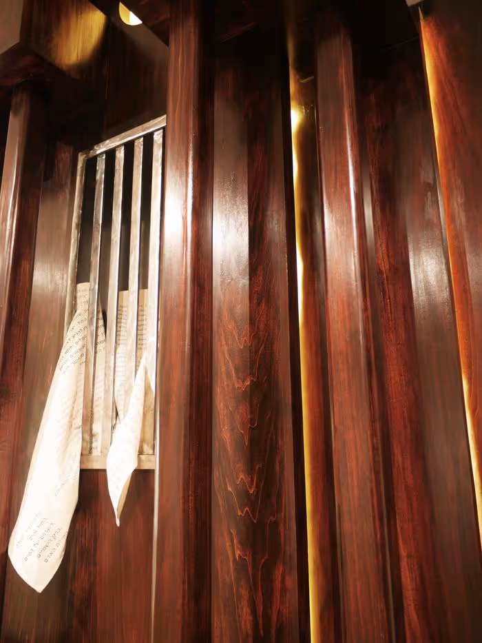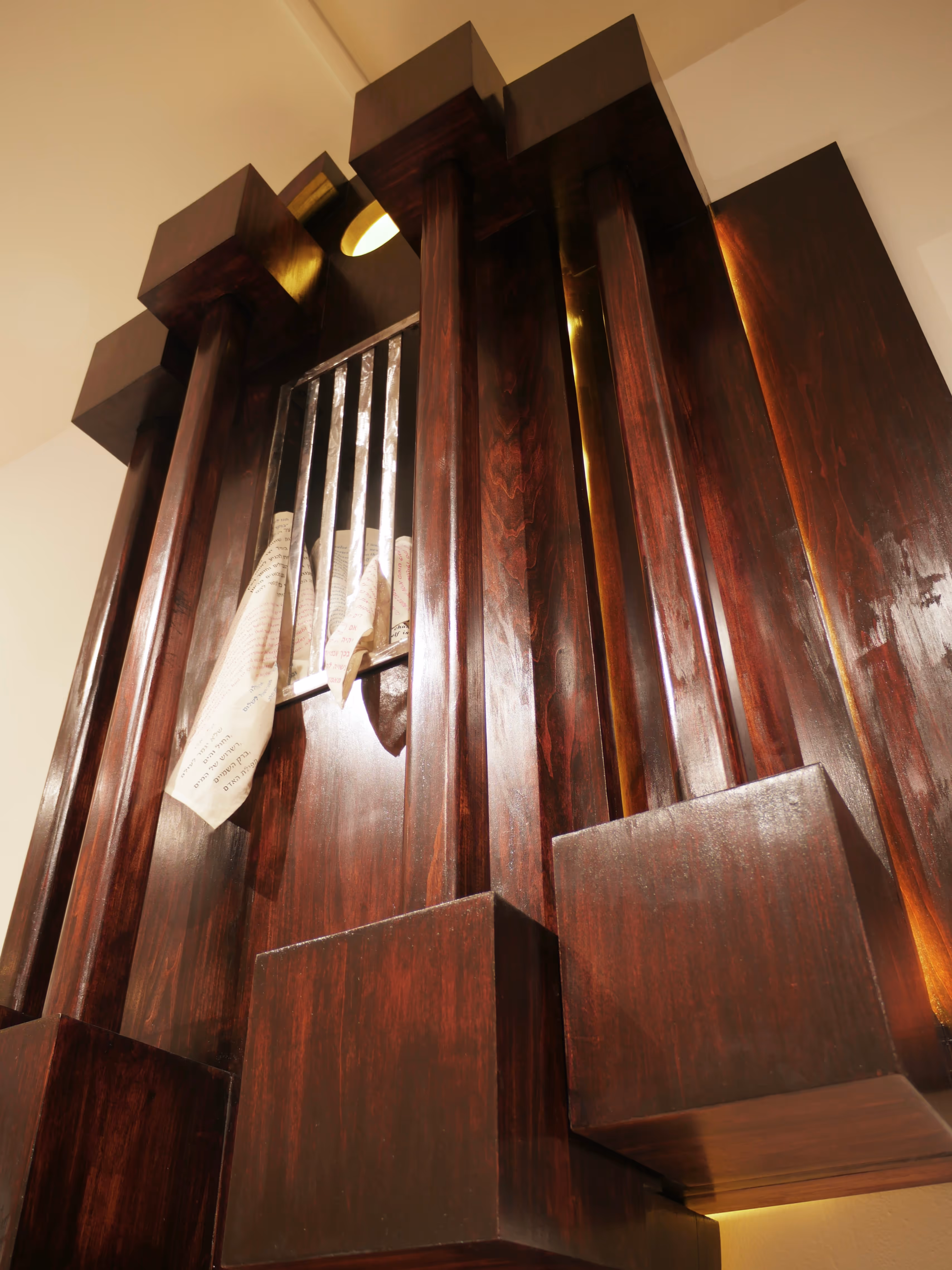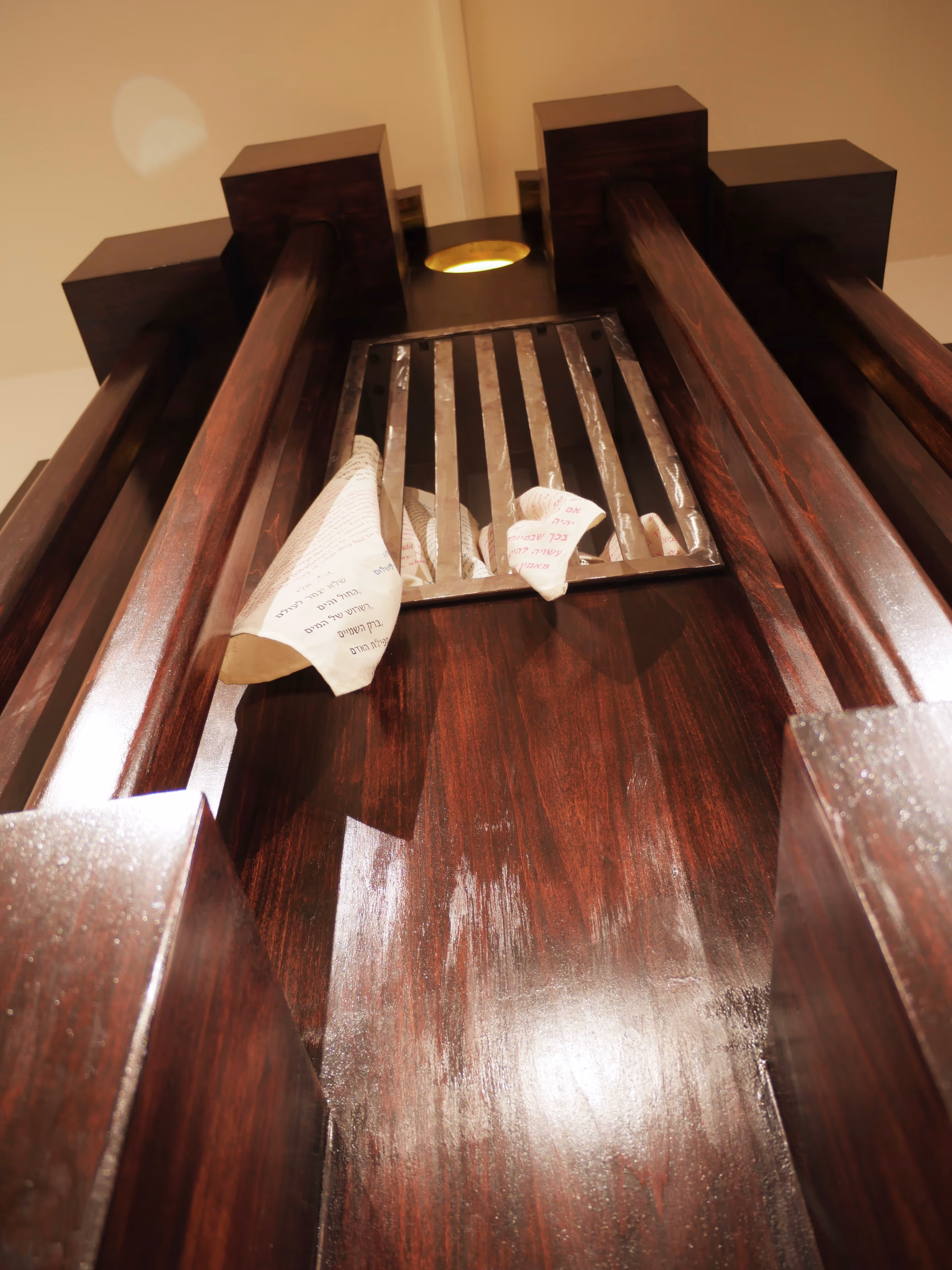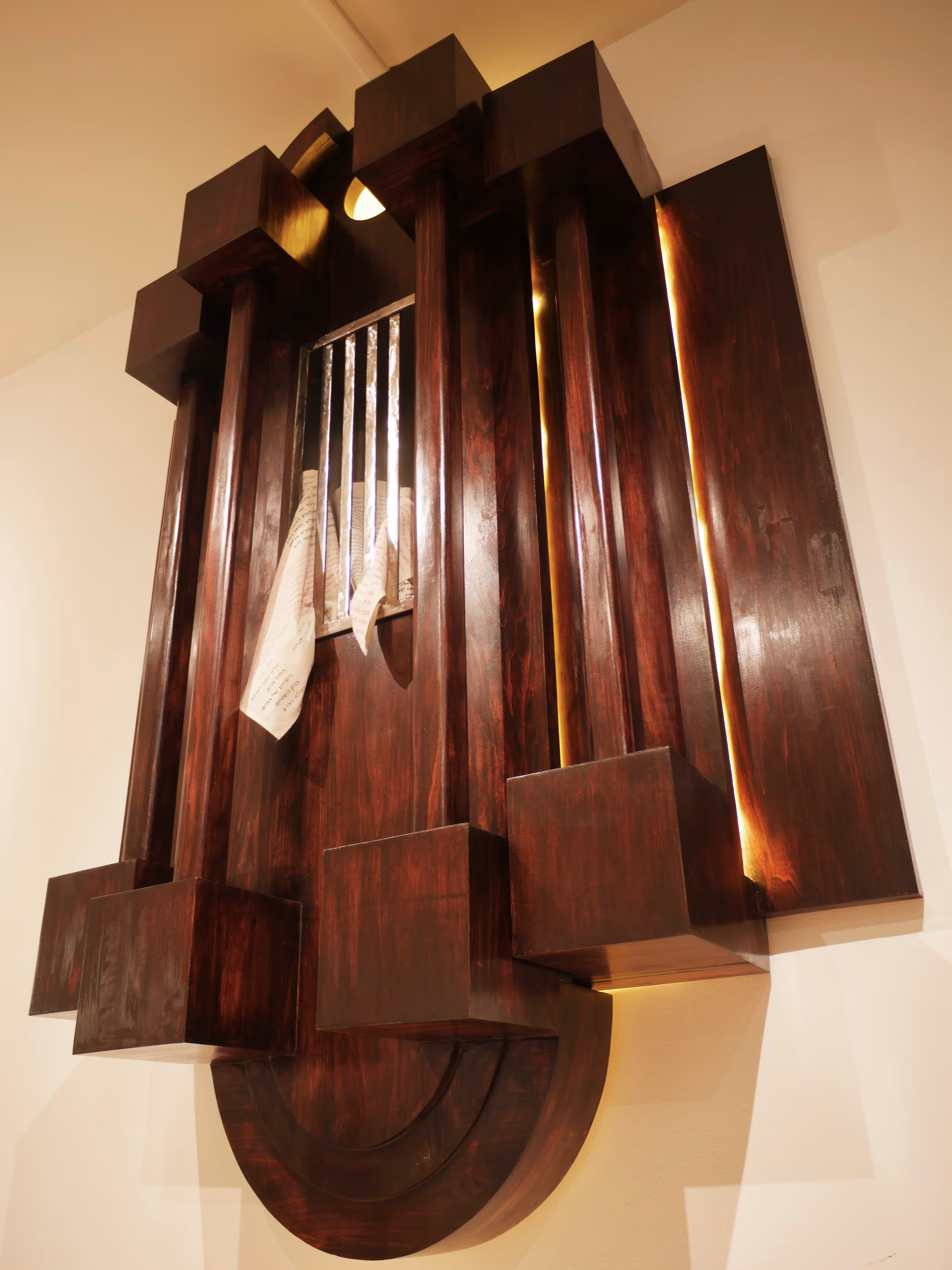 This closet is a solid and imposing facade of steel and wood shaped by generations of tradition that harbors and hides the amalgamation of defining beliefs and values, both aligned and in conflict with the Jewish and Queer communities. But as solid as the closet needs to be, the tighter the core of this person is restrained, the more they yearn for release.