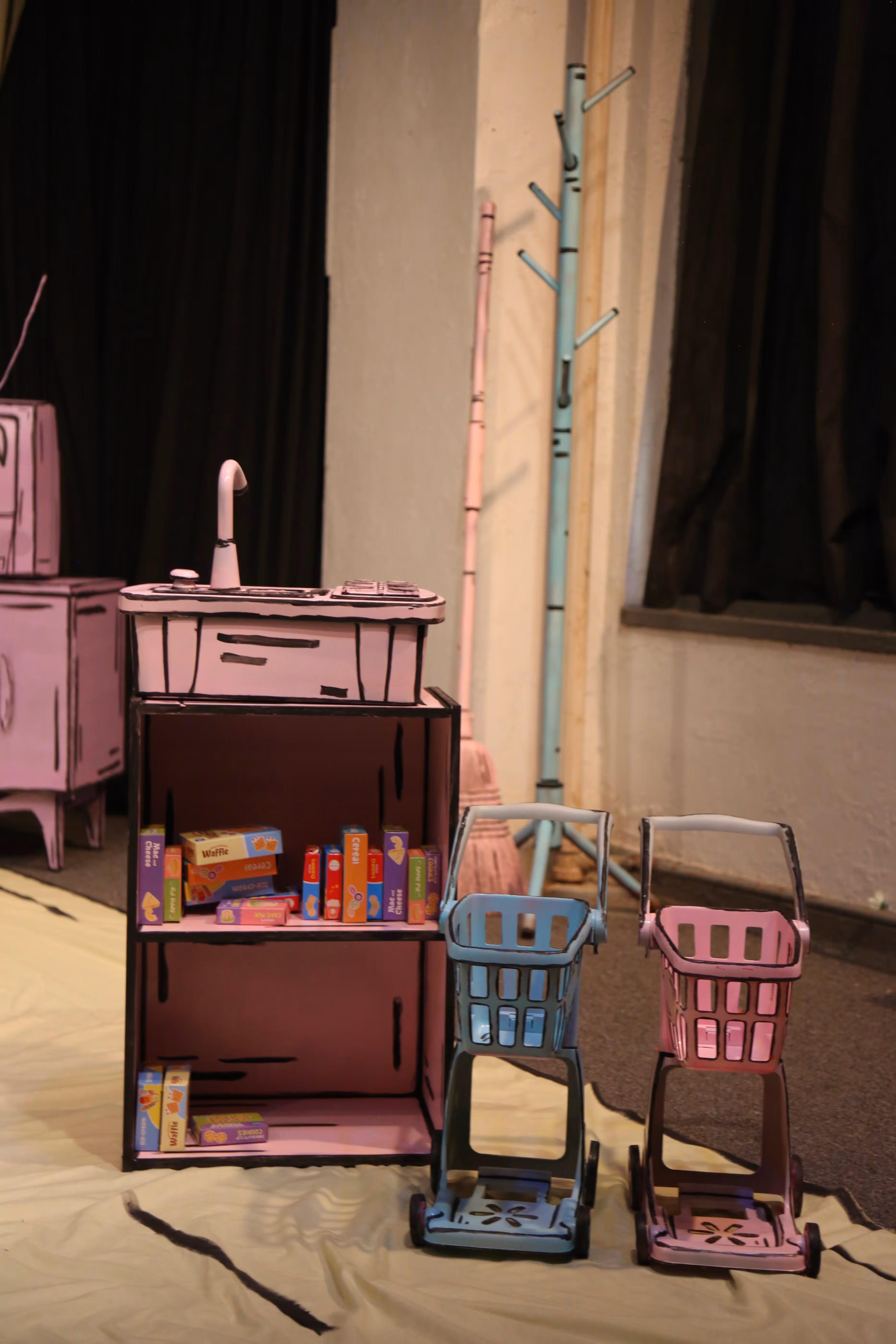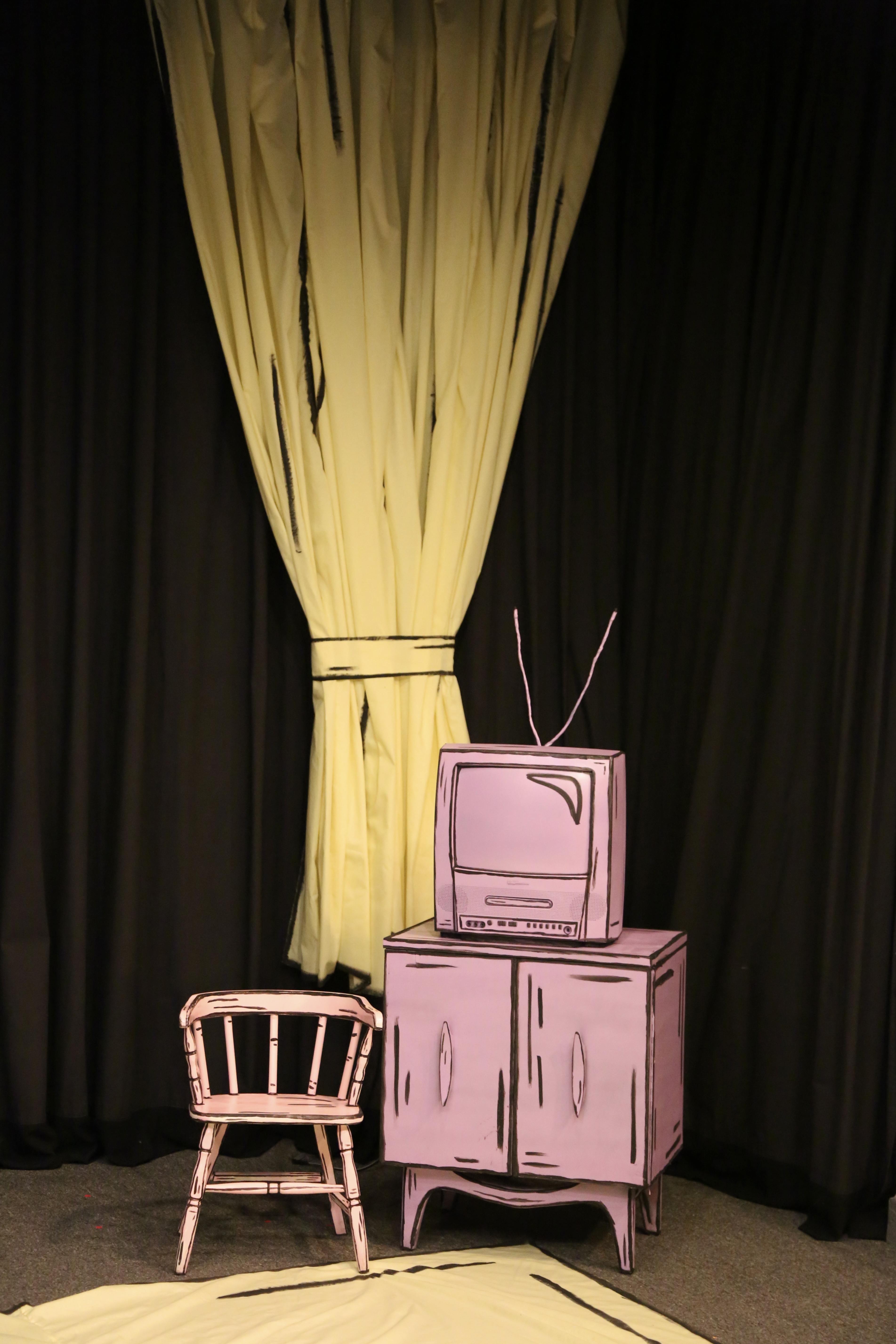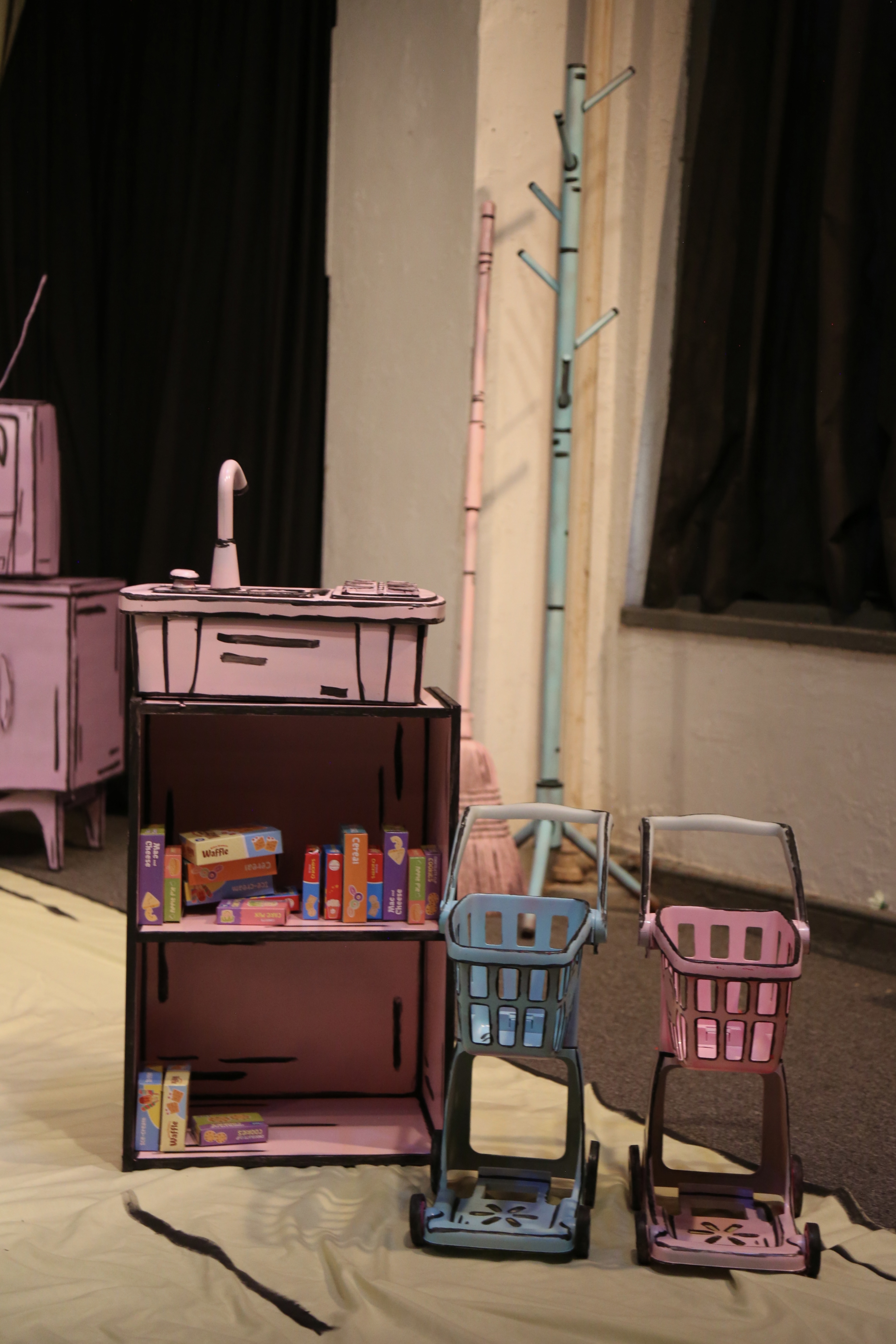 - The set is of a surreal and cartoonish playroom that distorts scale and reality.