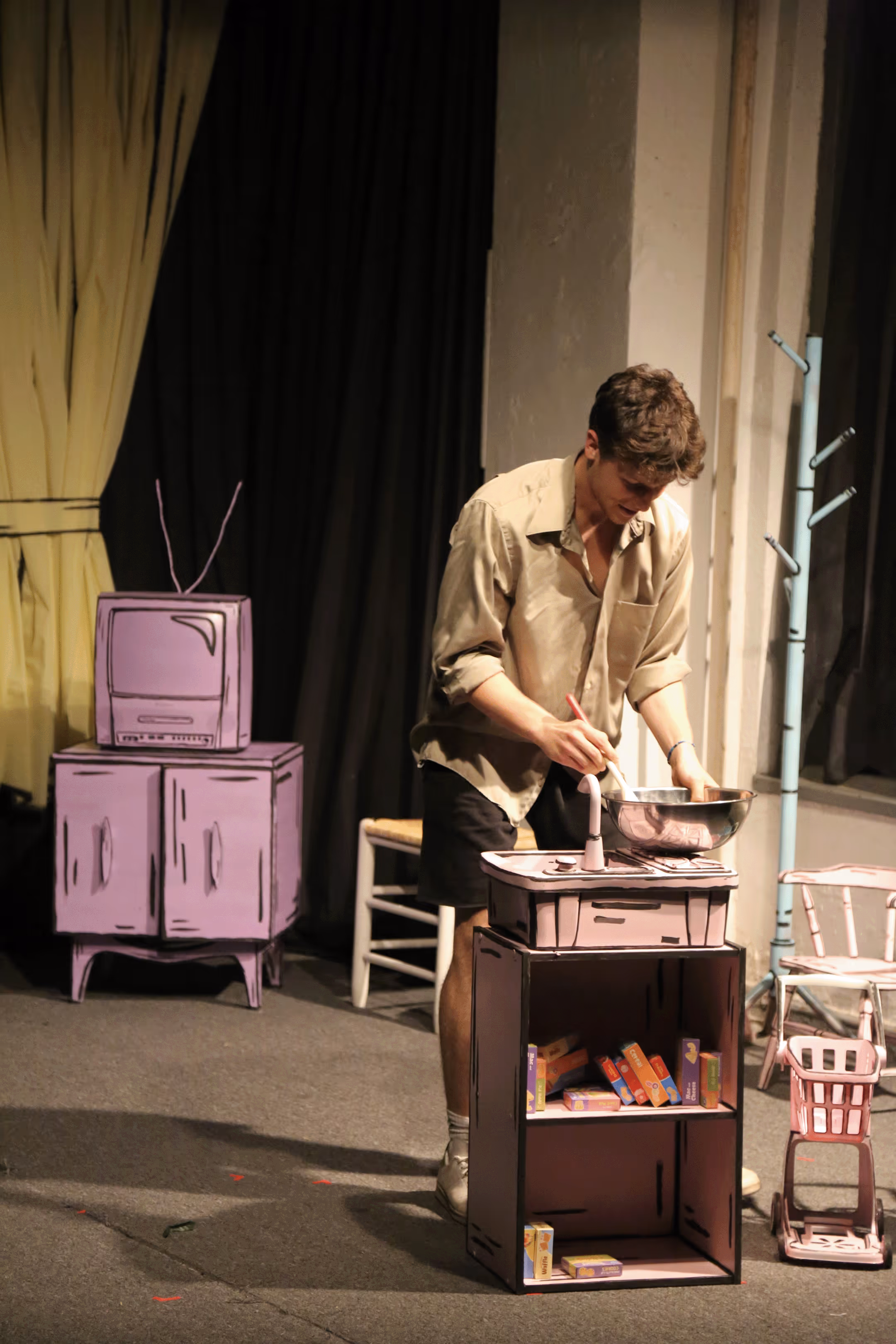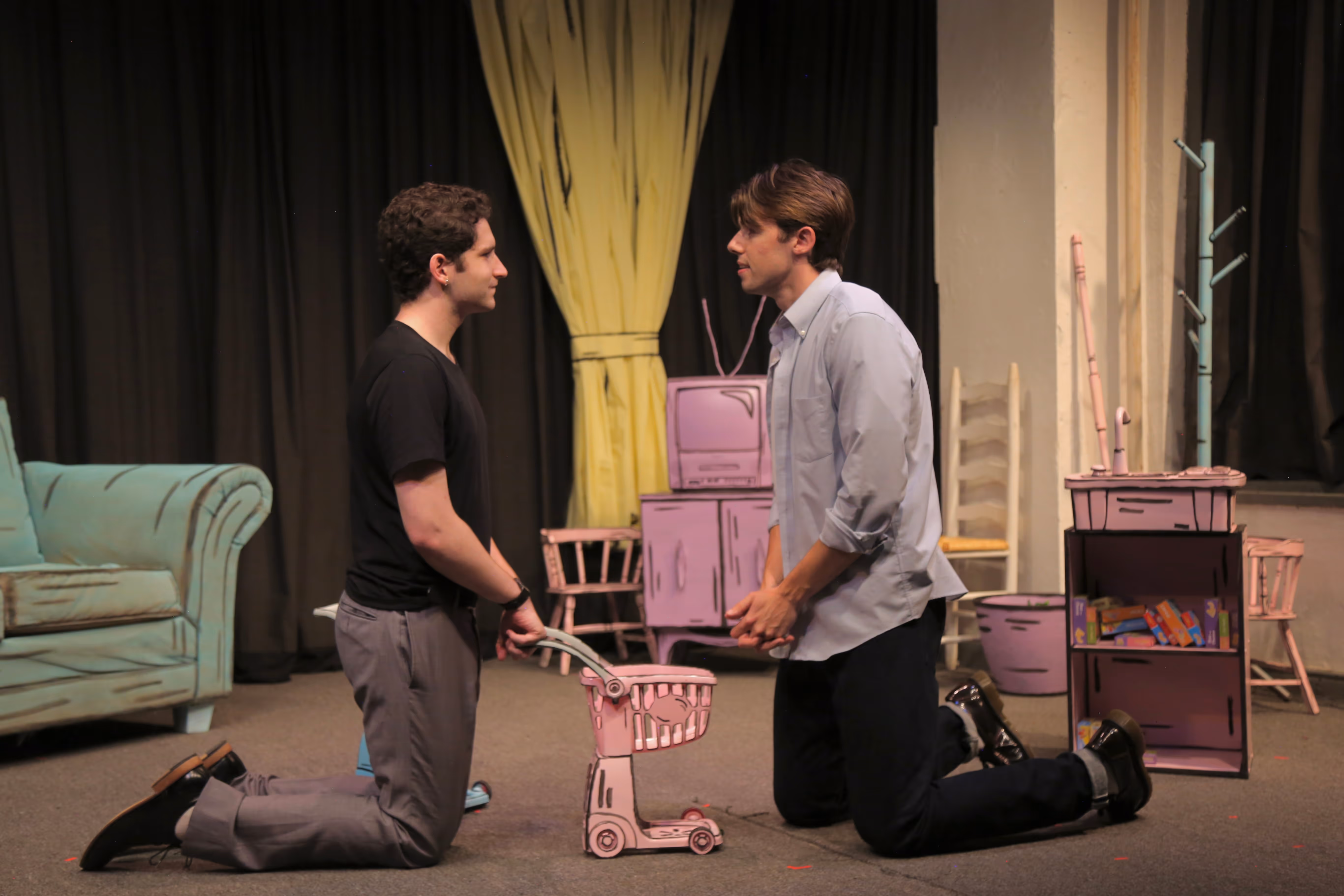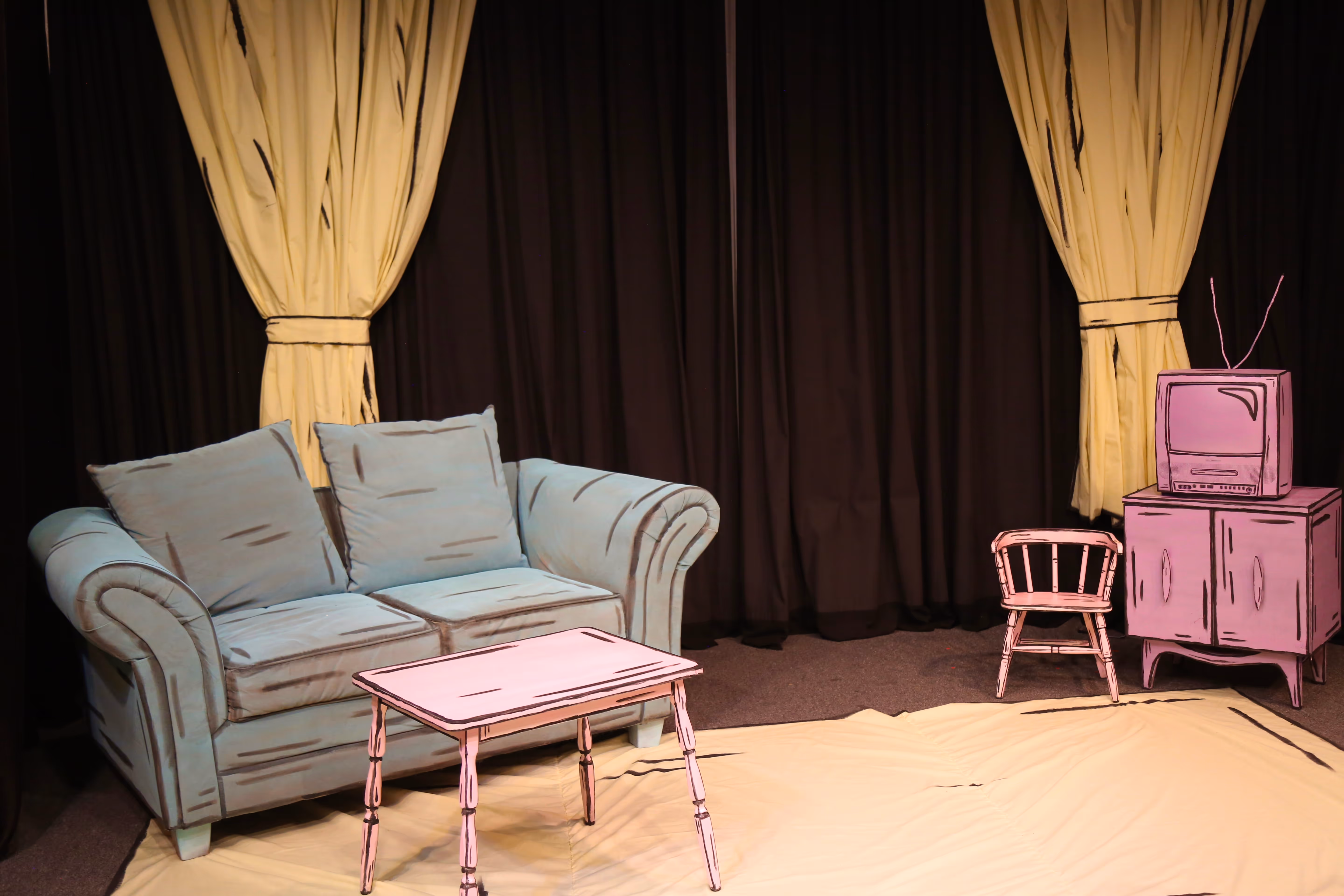 - The set is of a surreal and cartoonish playroom that distorts scale and reality.
