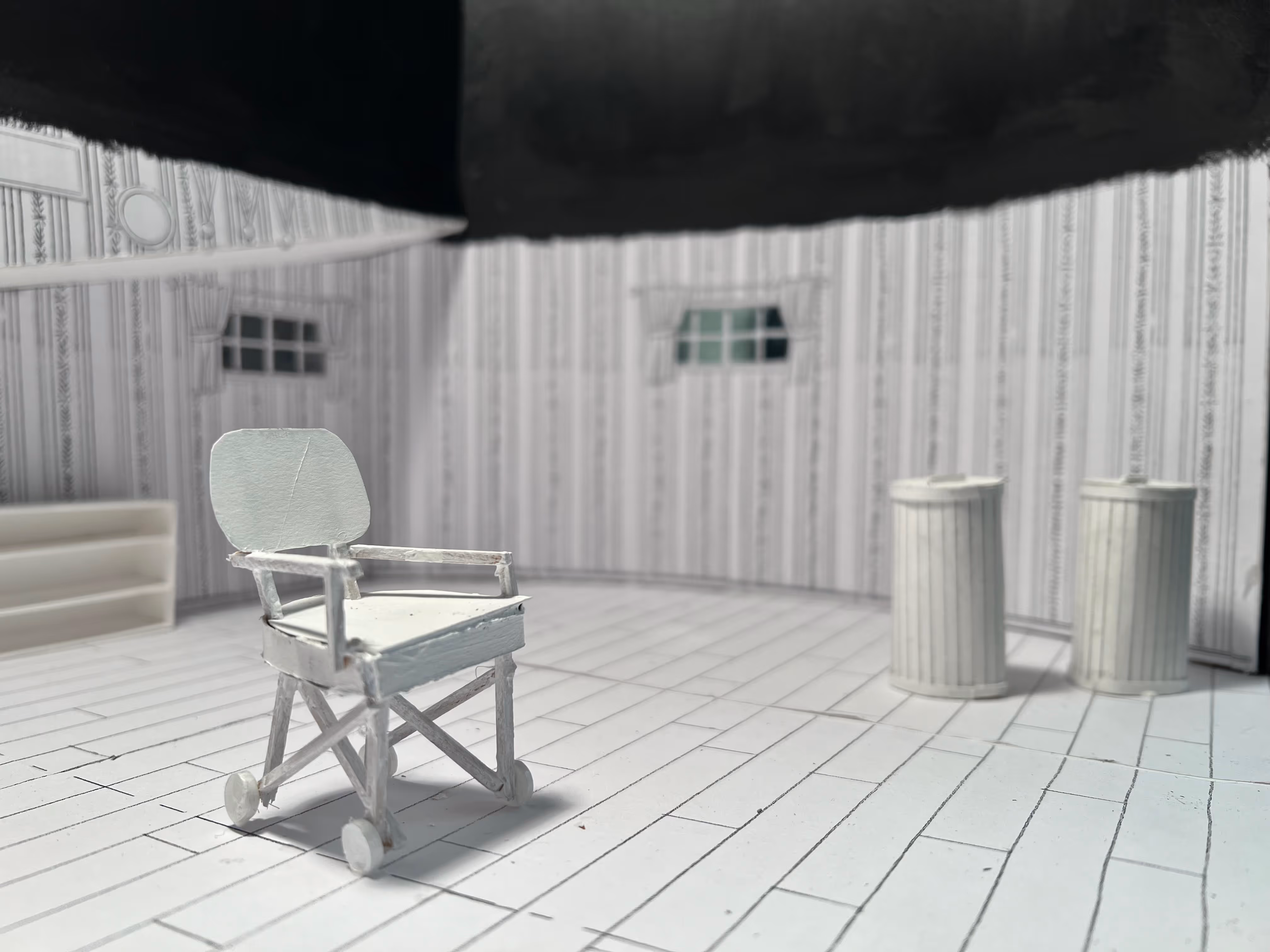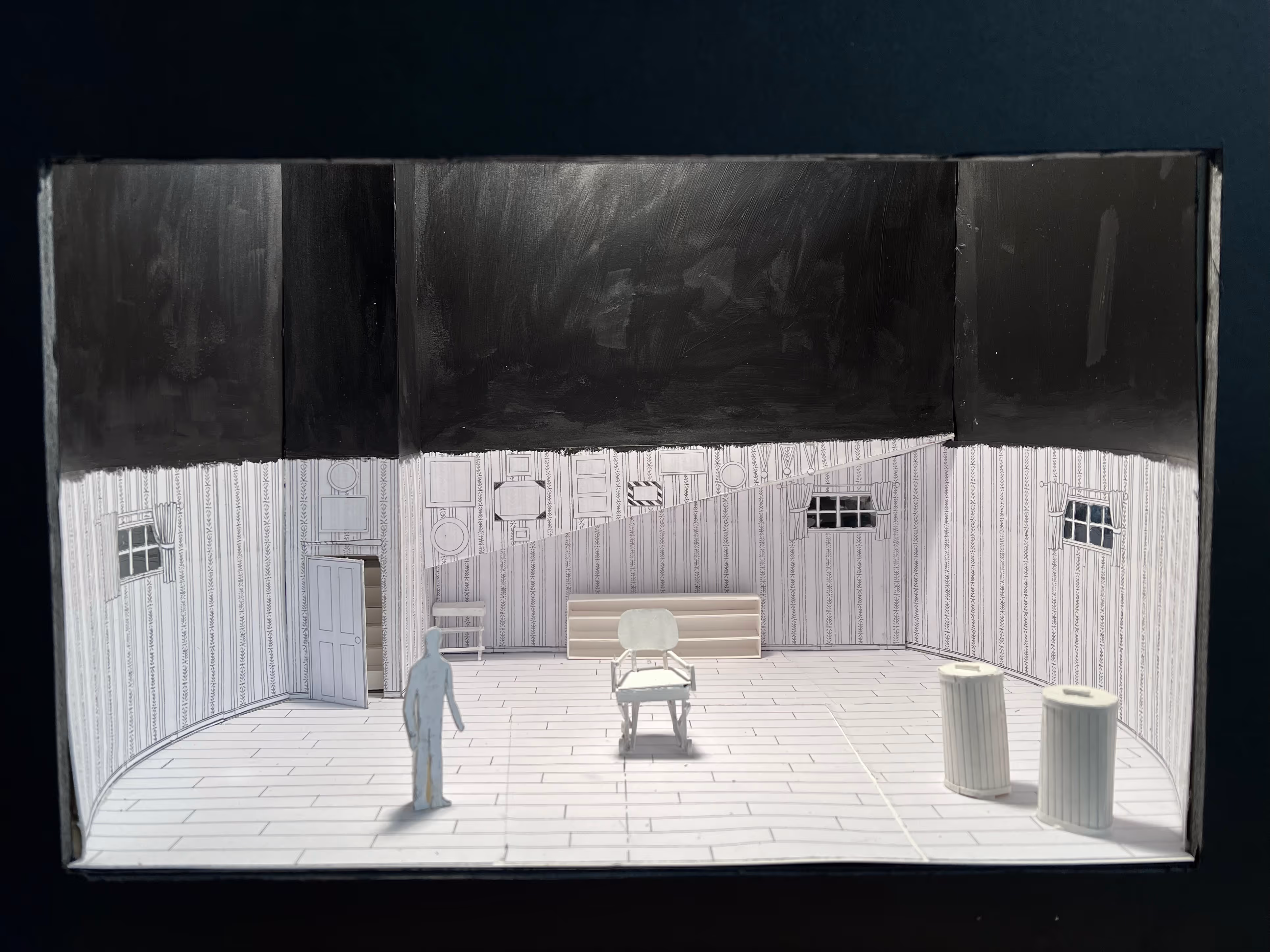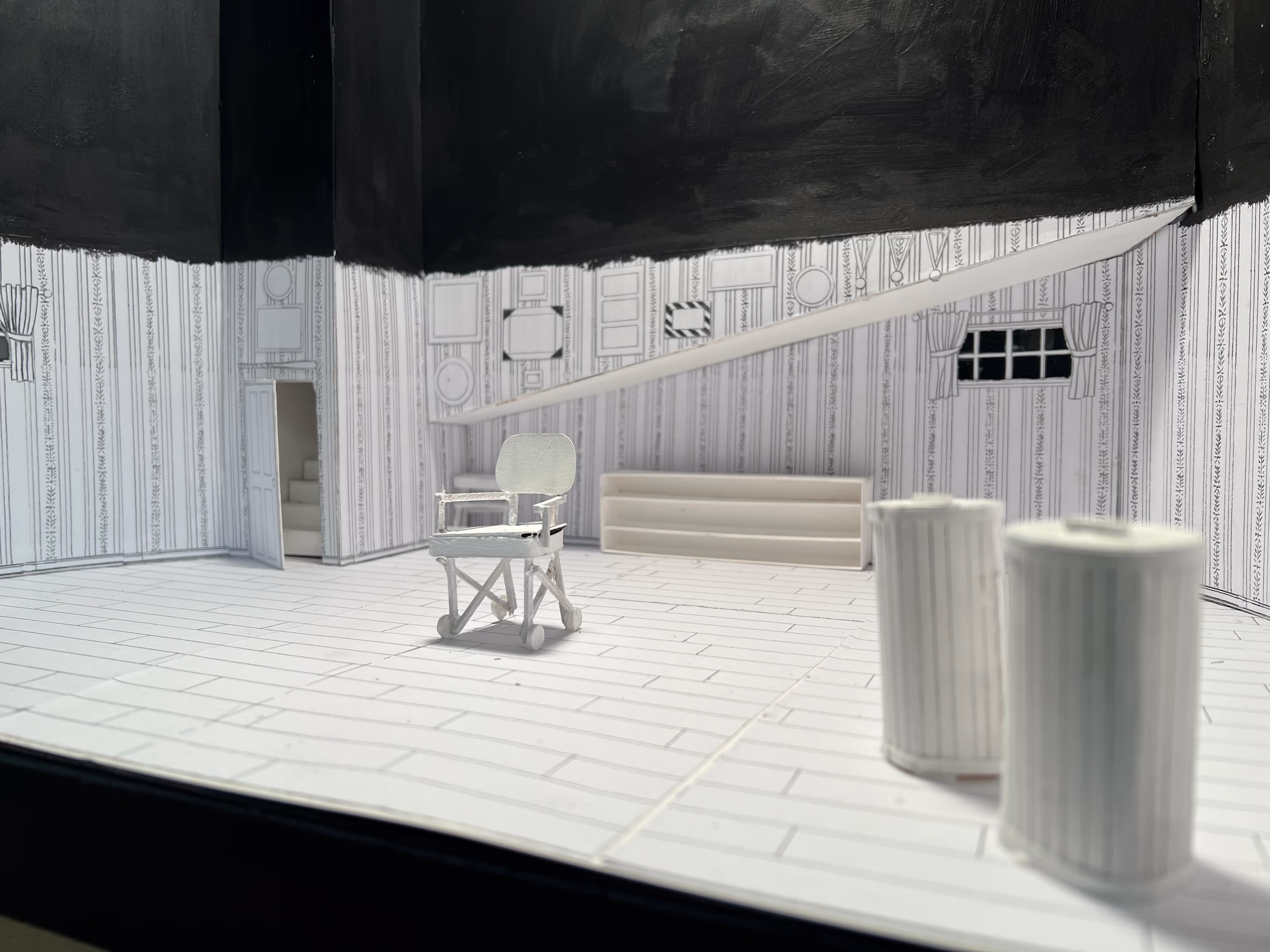 This set is both claustrophobic and endlessly expansive. The severe distortion, the low termination of the wallpaper, and the seemingly infinite height of the walls create this duality and the feeling that the characters are either trapped in a decrepit 1950s basement or at the bottom of some pit. But who really knows where the characters are and why? After all, Hamm is blind and alone. This can all be a hallucination he is having right before he meets his end….
