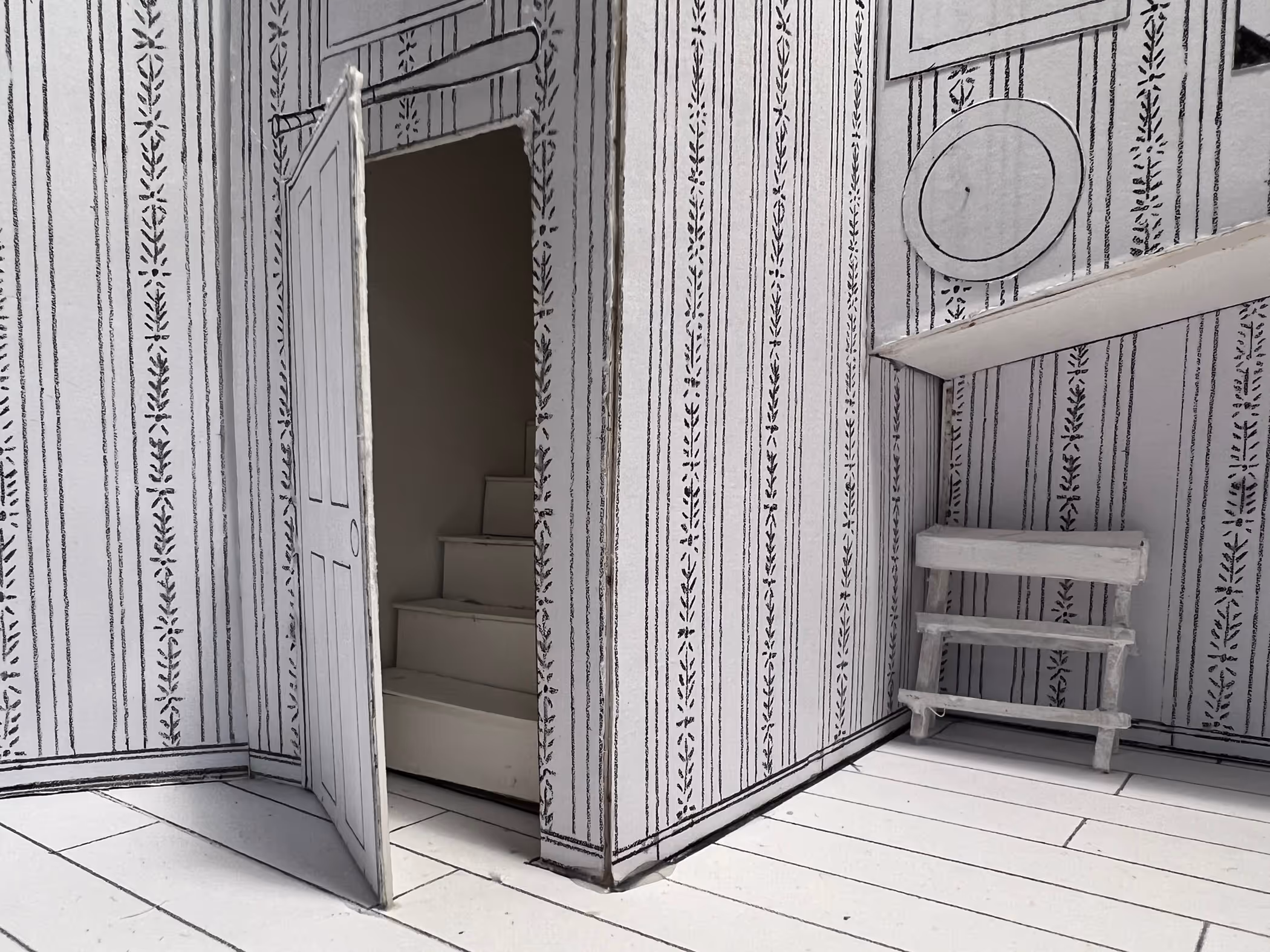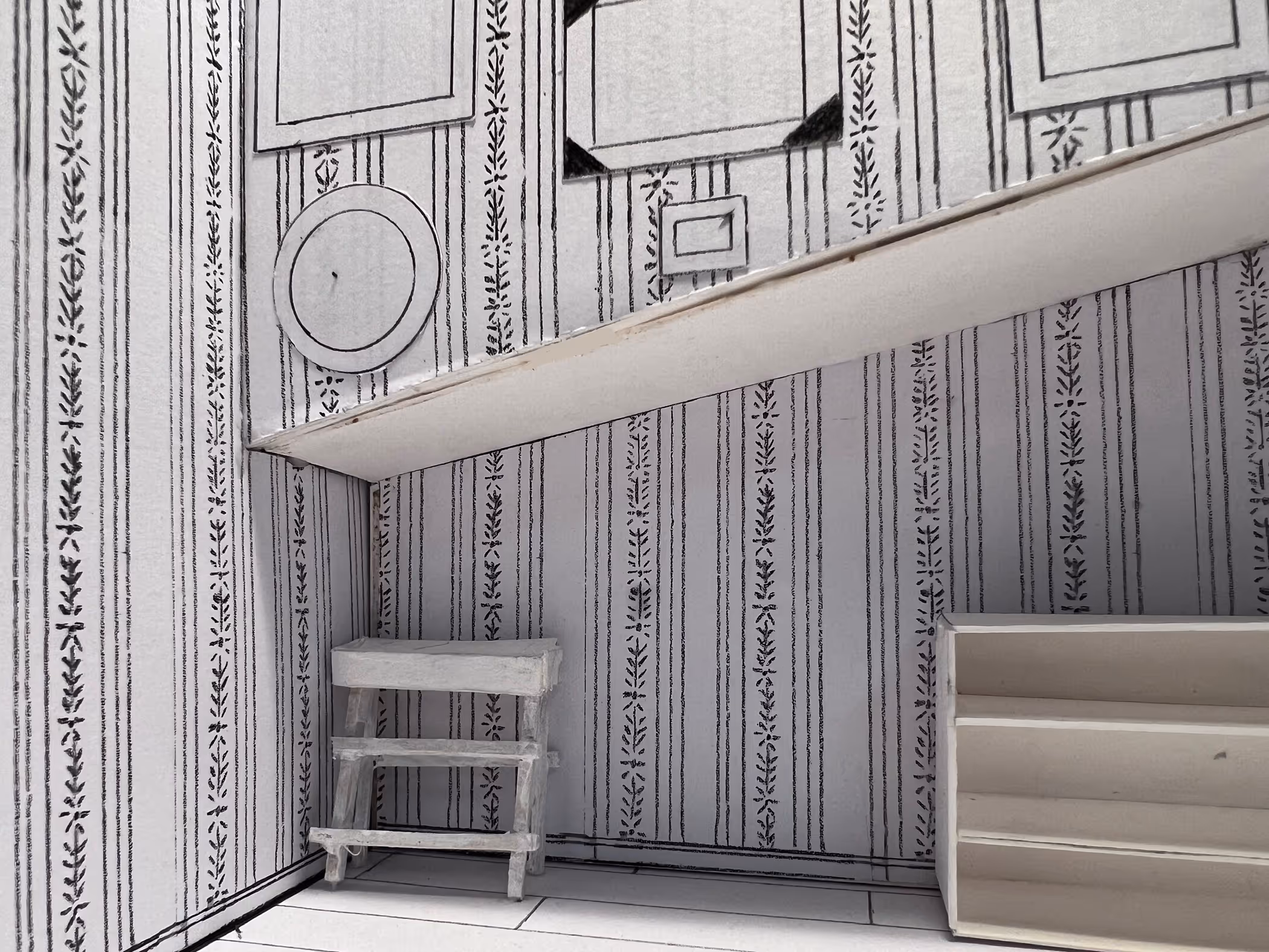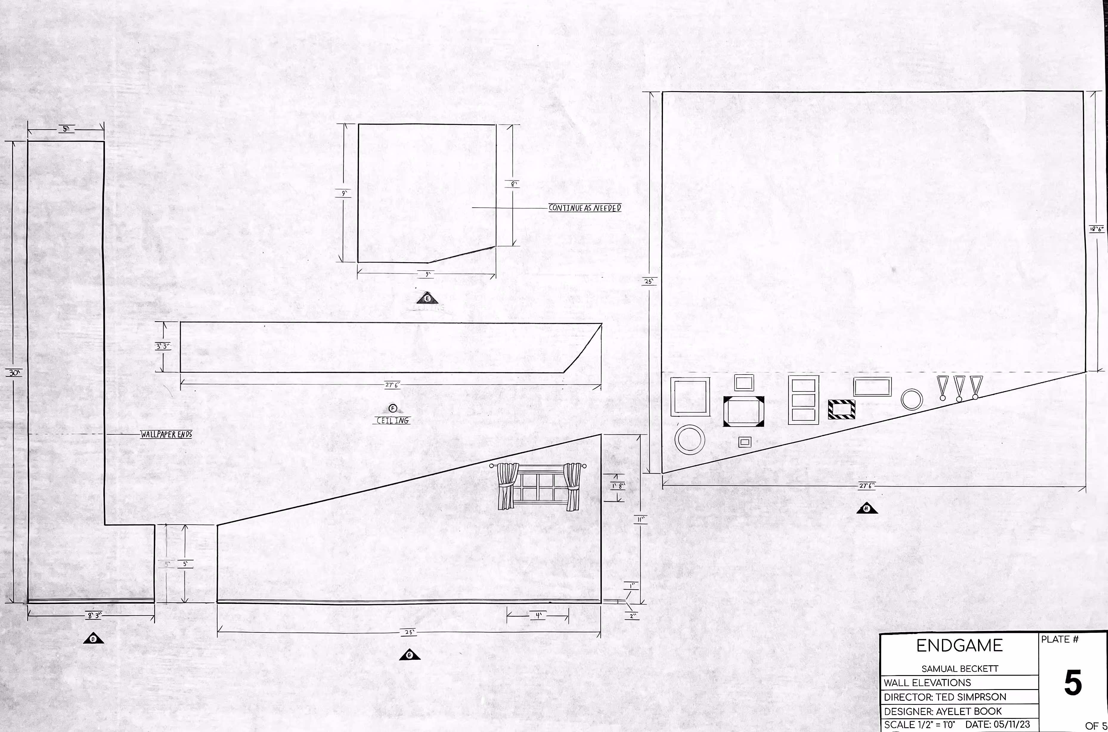 This set is both claustrophobic and endlessly expansive. The severe distortion, the low termination of the wallpaper, and the seemingly infinite height of the walls create this duality and the feeling that the characters are either trapped in a decrepit 1950s basement or at the bottom of some pit. But who really knows where the characters are and why? After all, Hamm is blind and alone. This can all be a hallucination he is having right before he meets his end….
