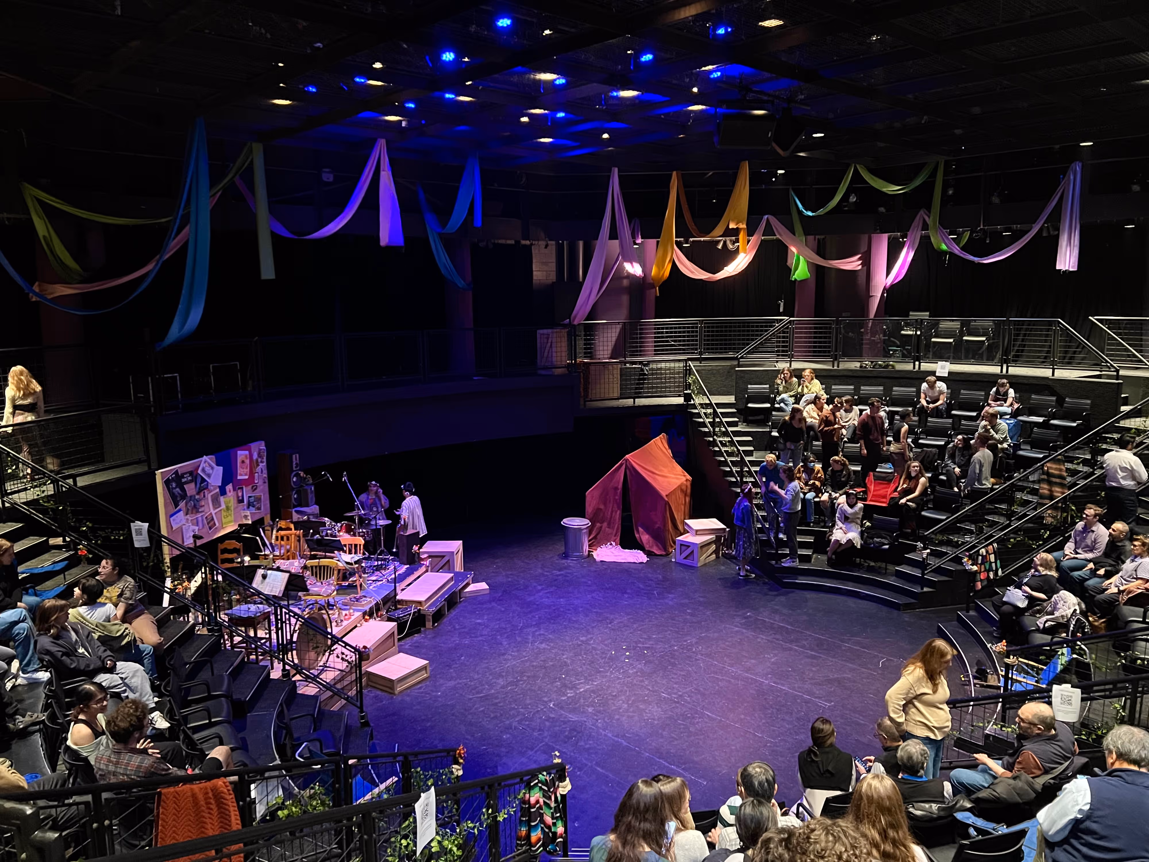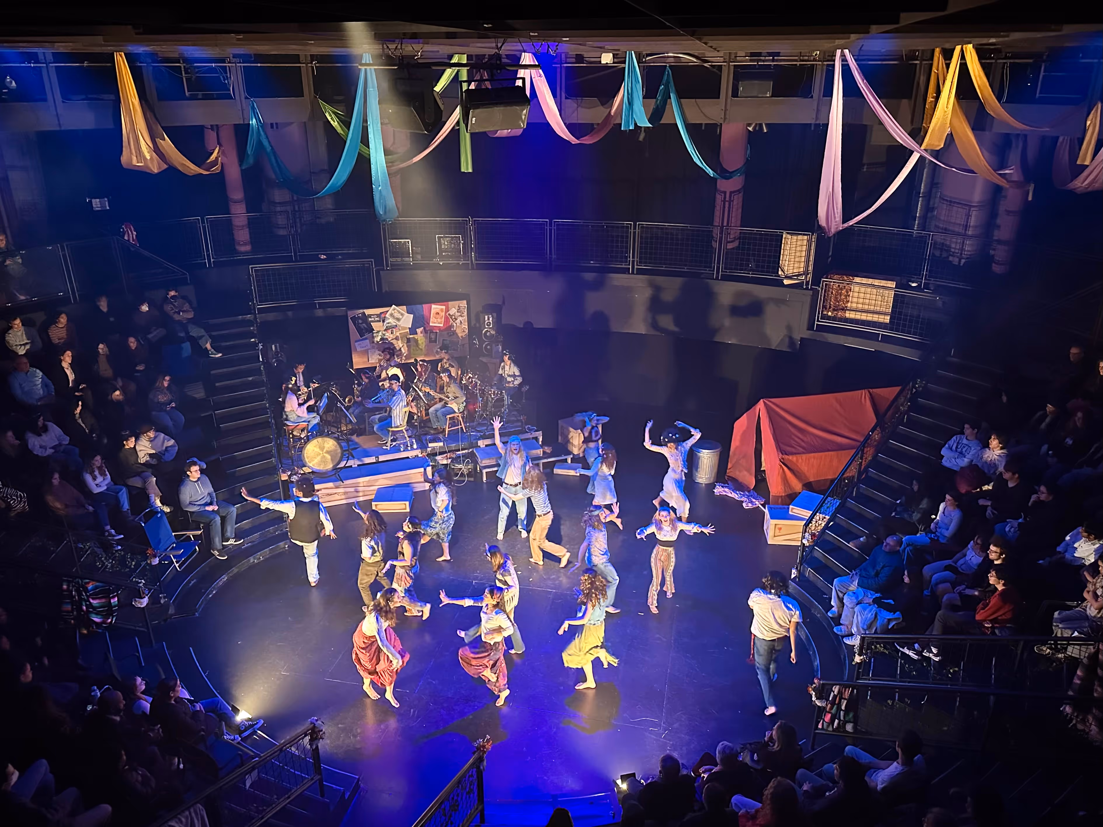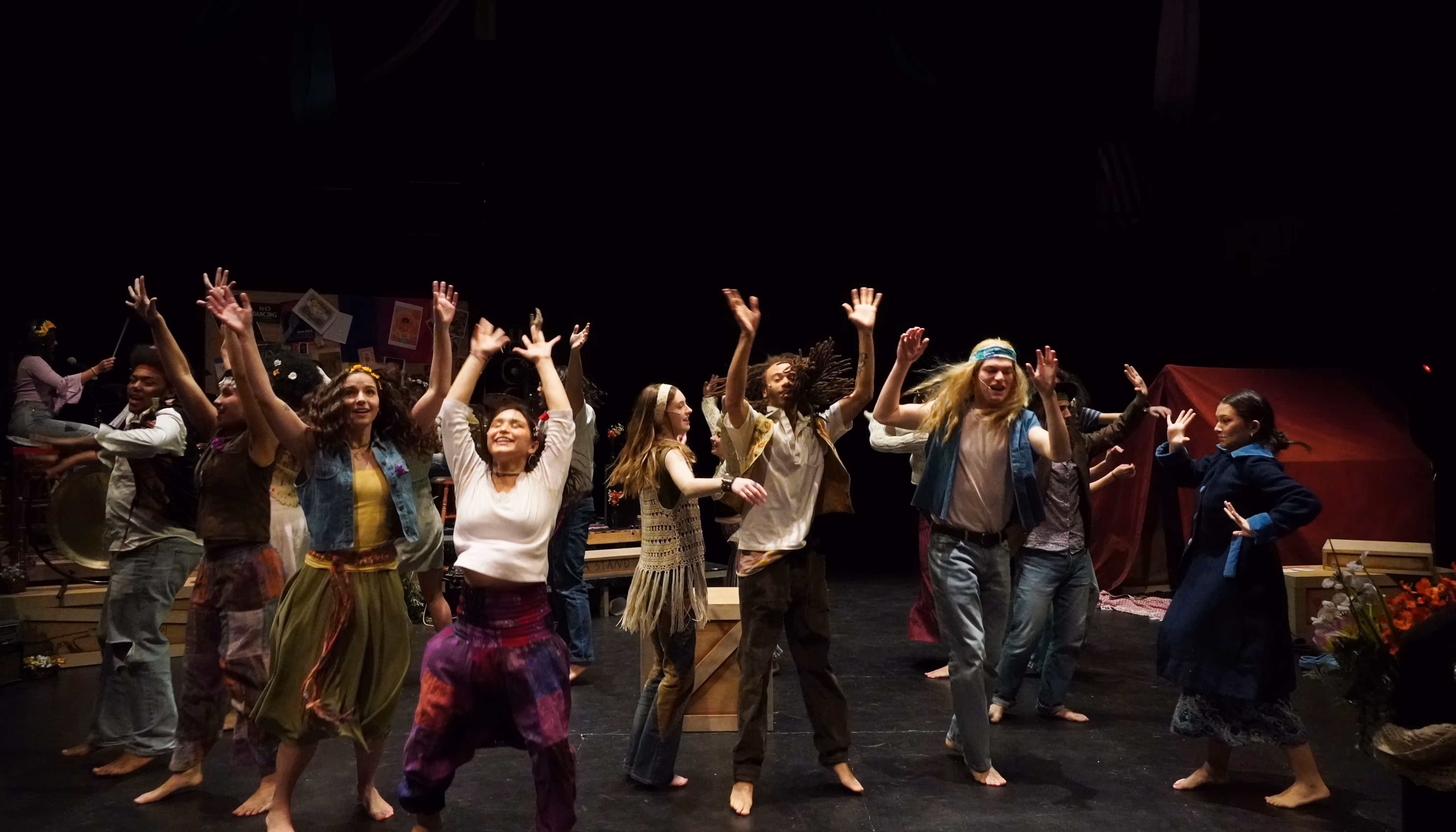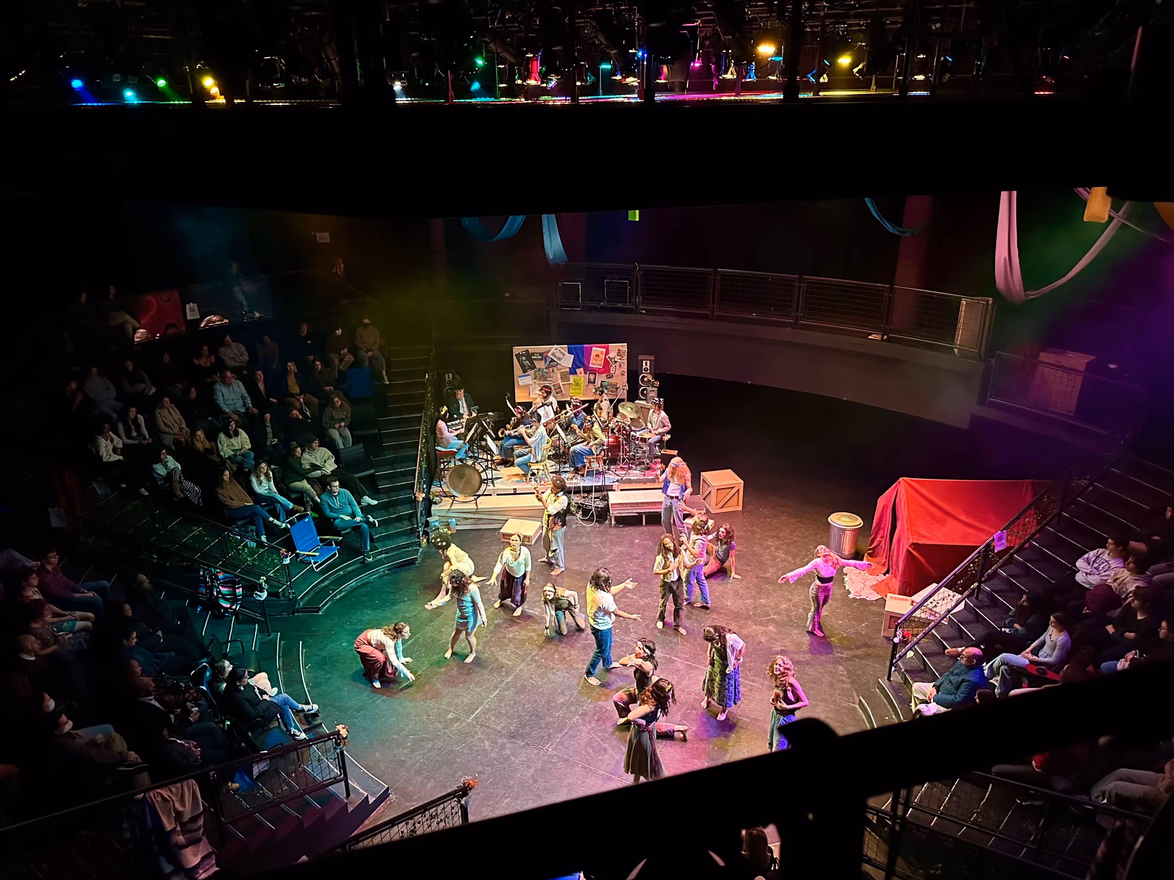 When stepping into the theater, it is clear that hippies took over and recreated the great outdoors using whatever they could find at their disposal. The heavy crates and large red tent ground the set while the pipe trees and colored fabrics made the open space feel light and expansive.