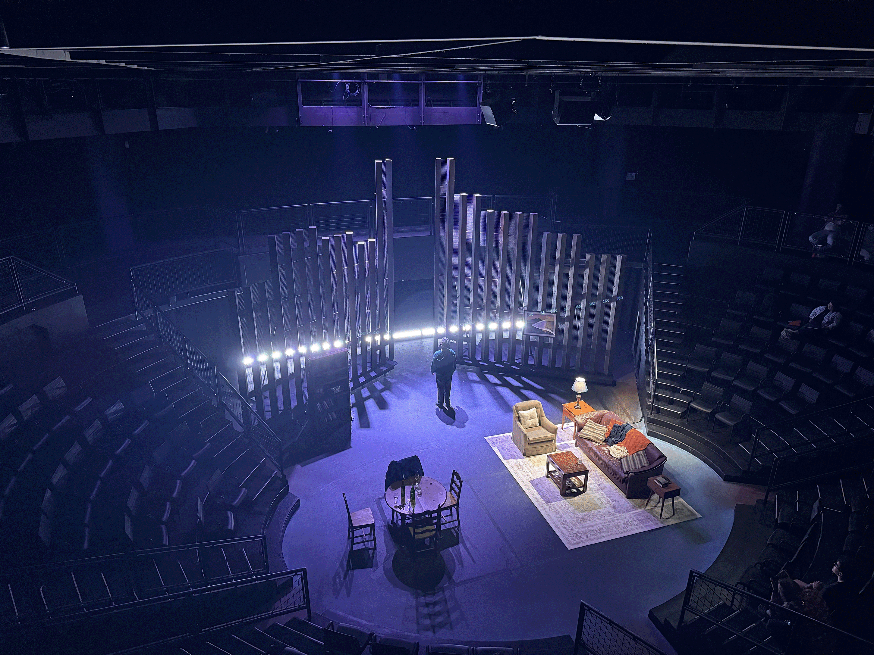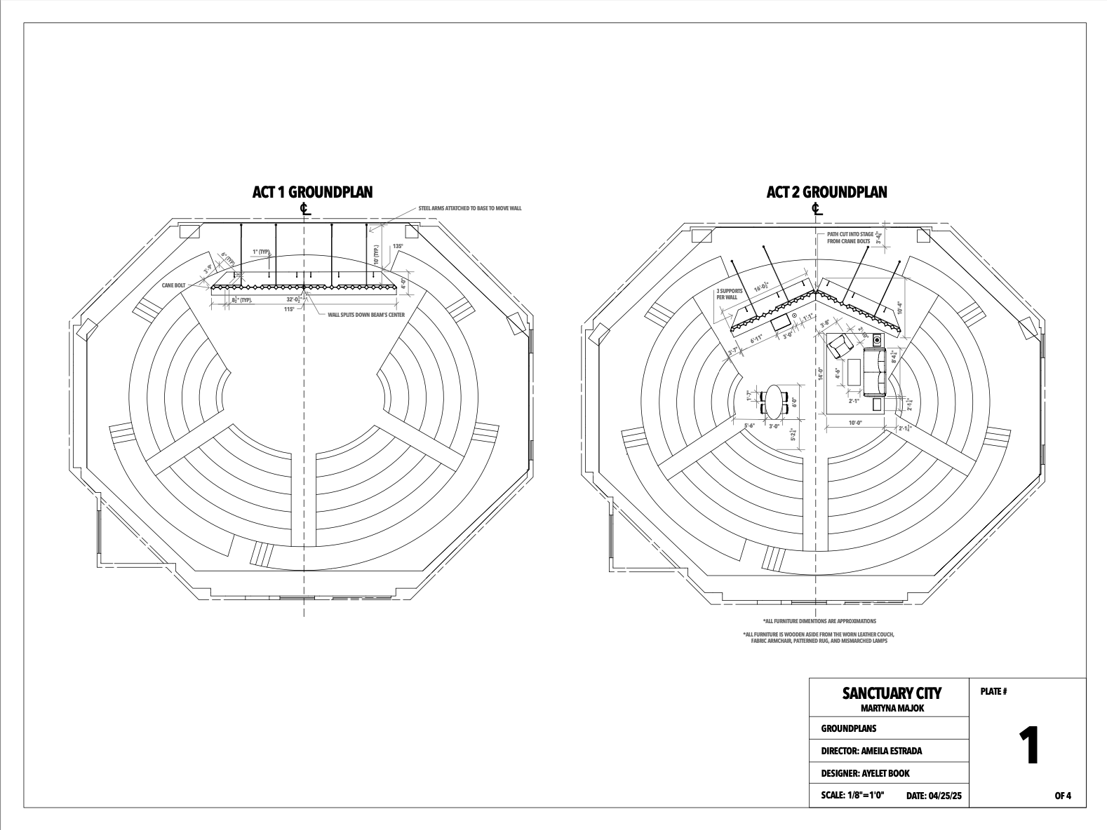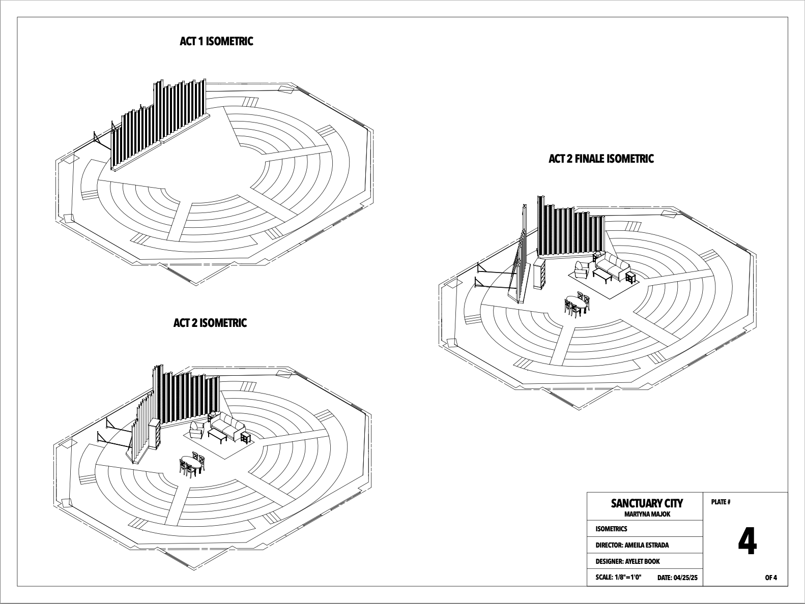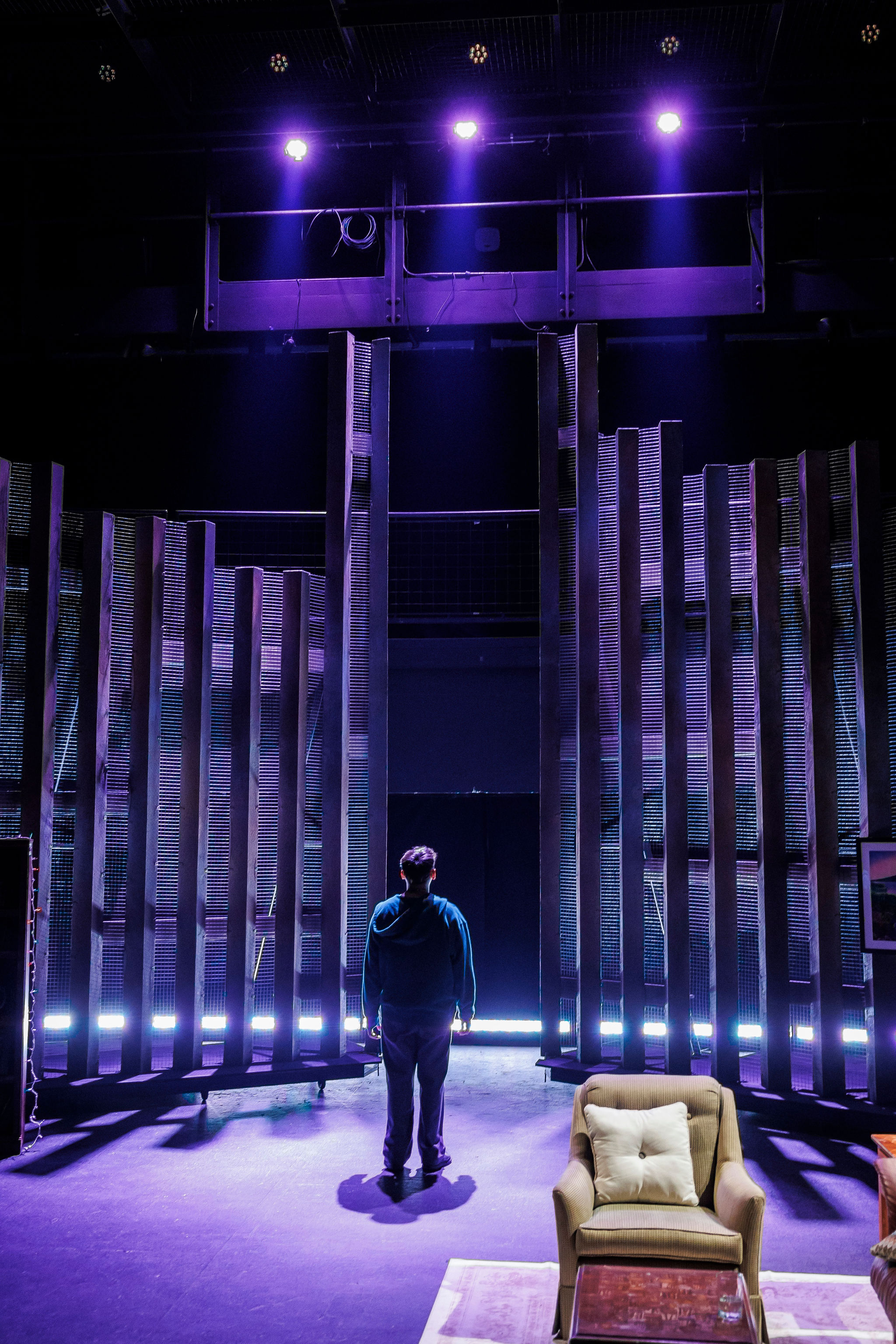 The goal of the set is to display the how the idea of America is both out of reach and yet it is still home to Dreamers. Therefore, this set features a large, looming wall in the background that also serves as an abstracted city. In act 2, the wall closes in and becomes the walls of a low-income apartment.