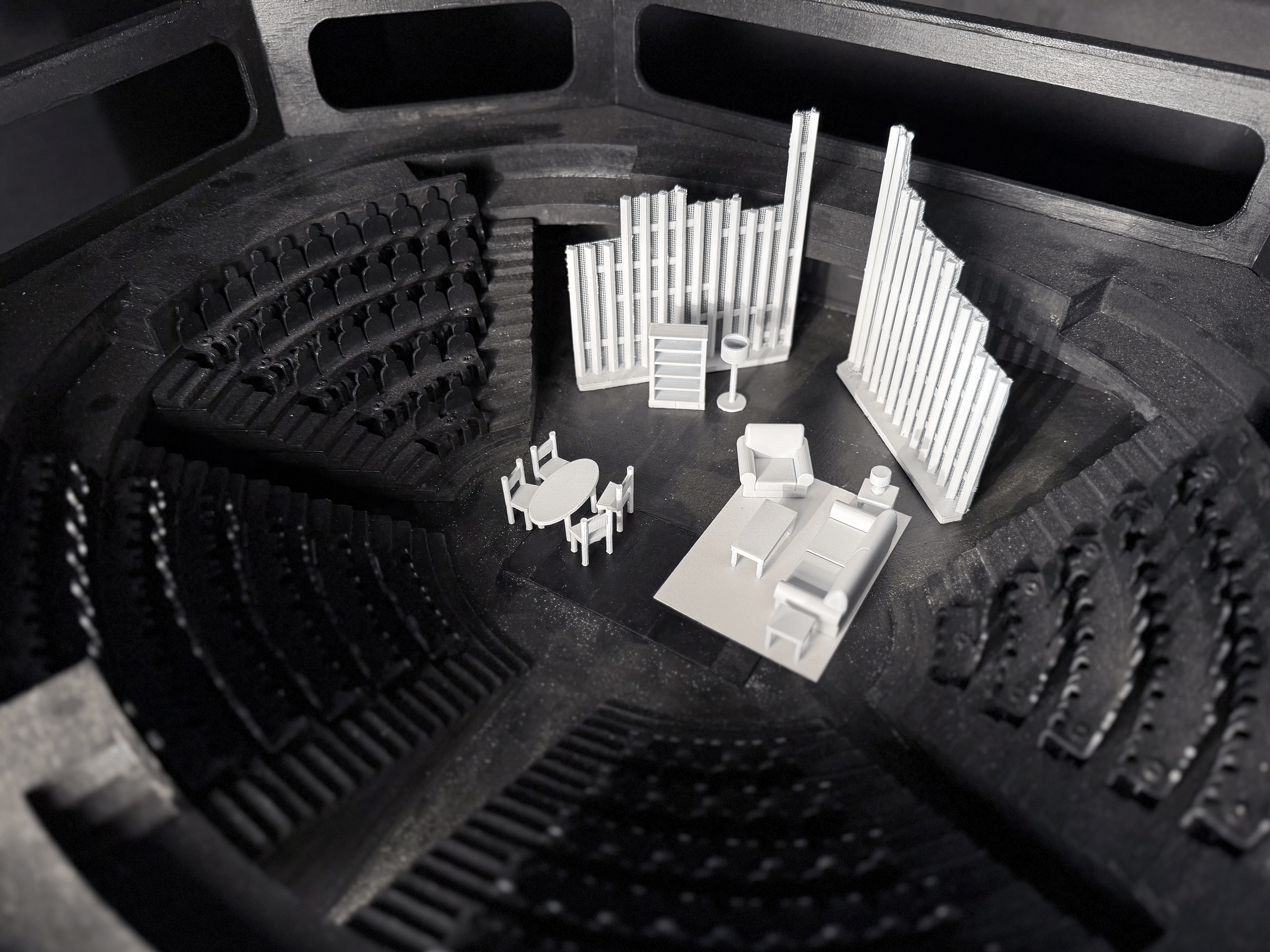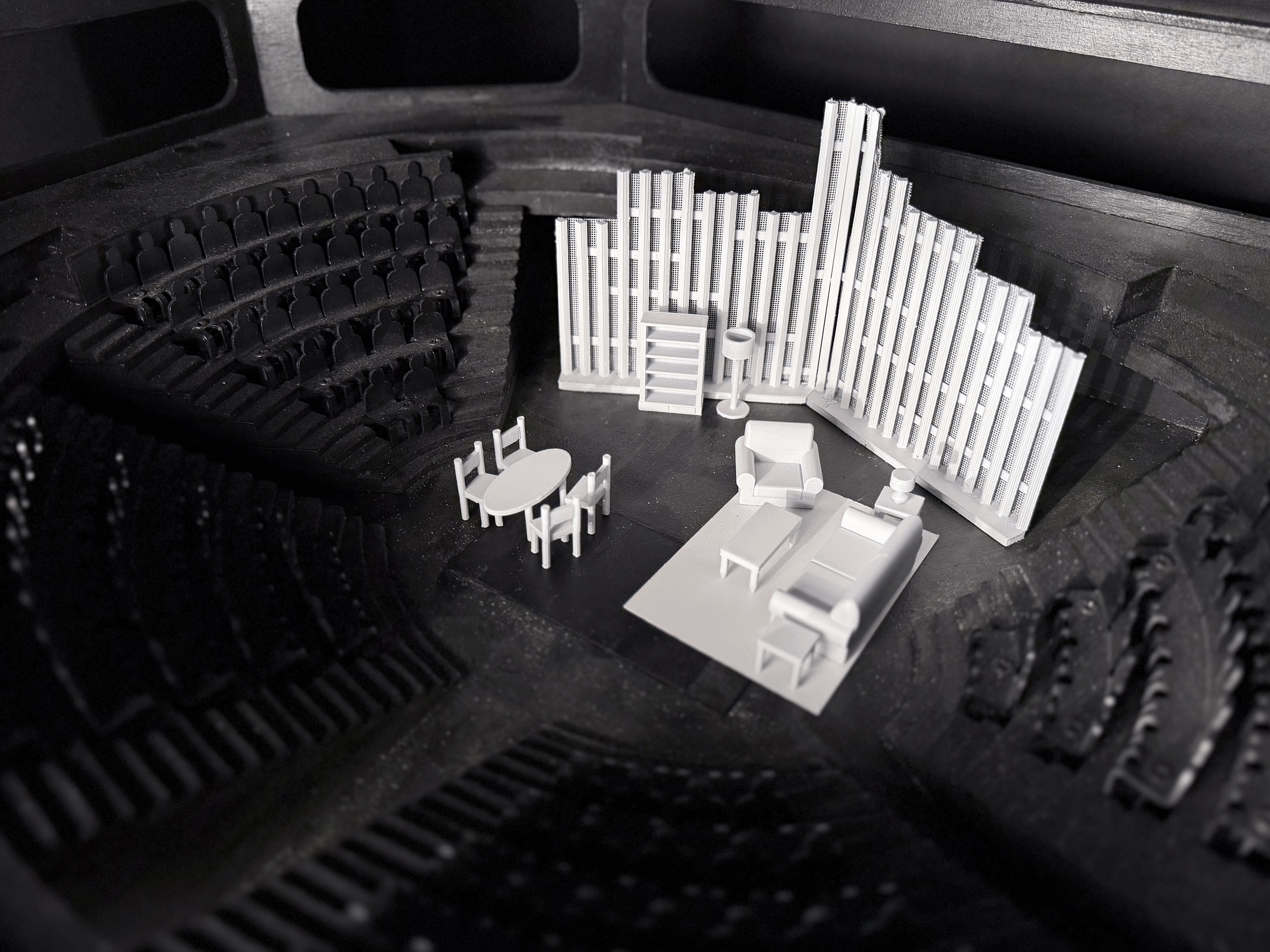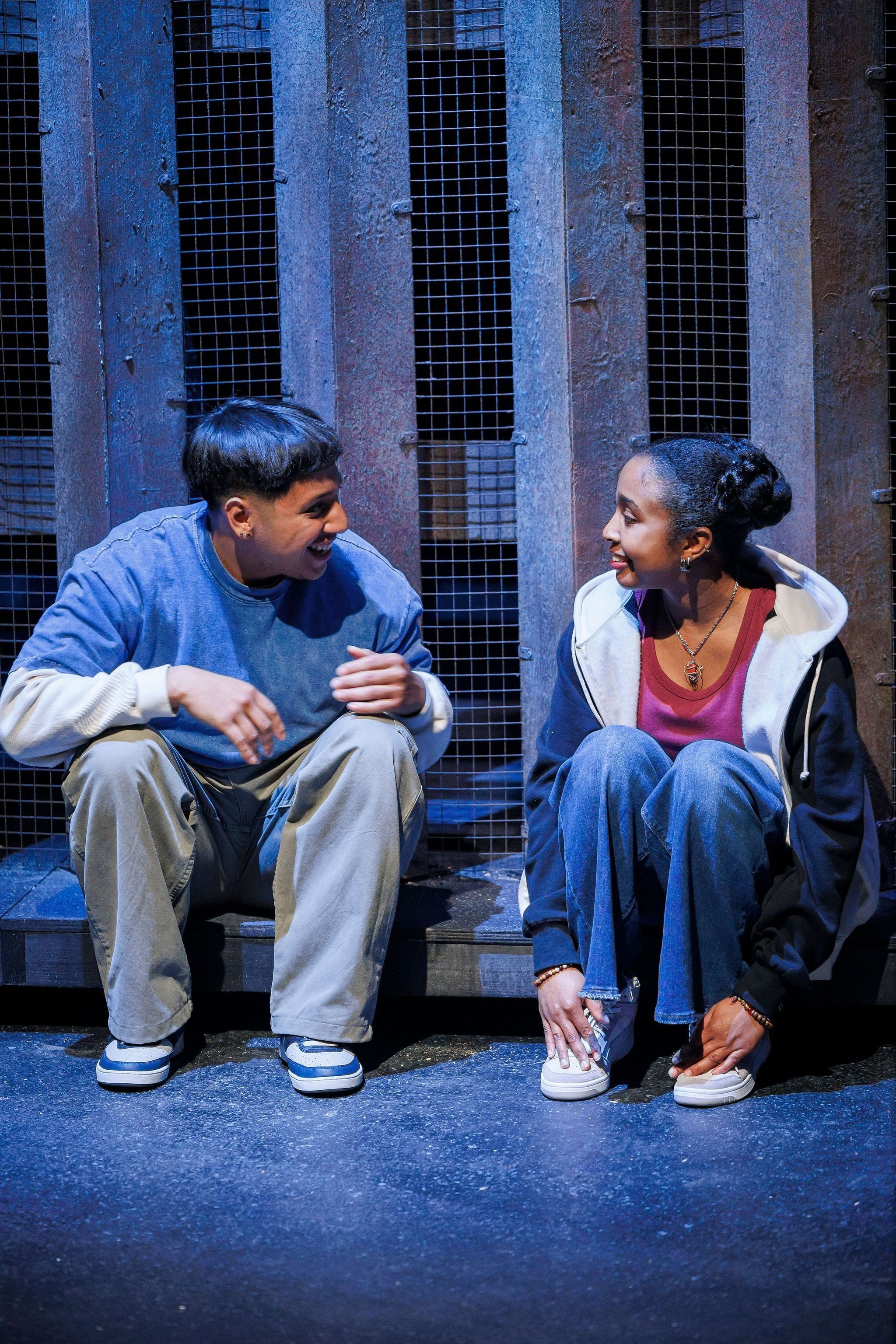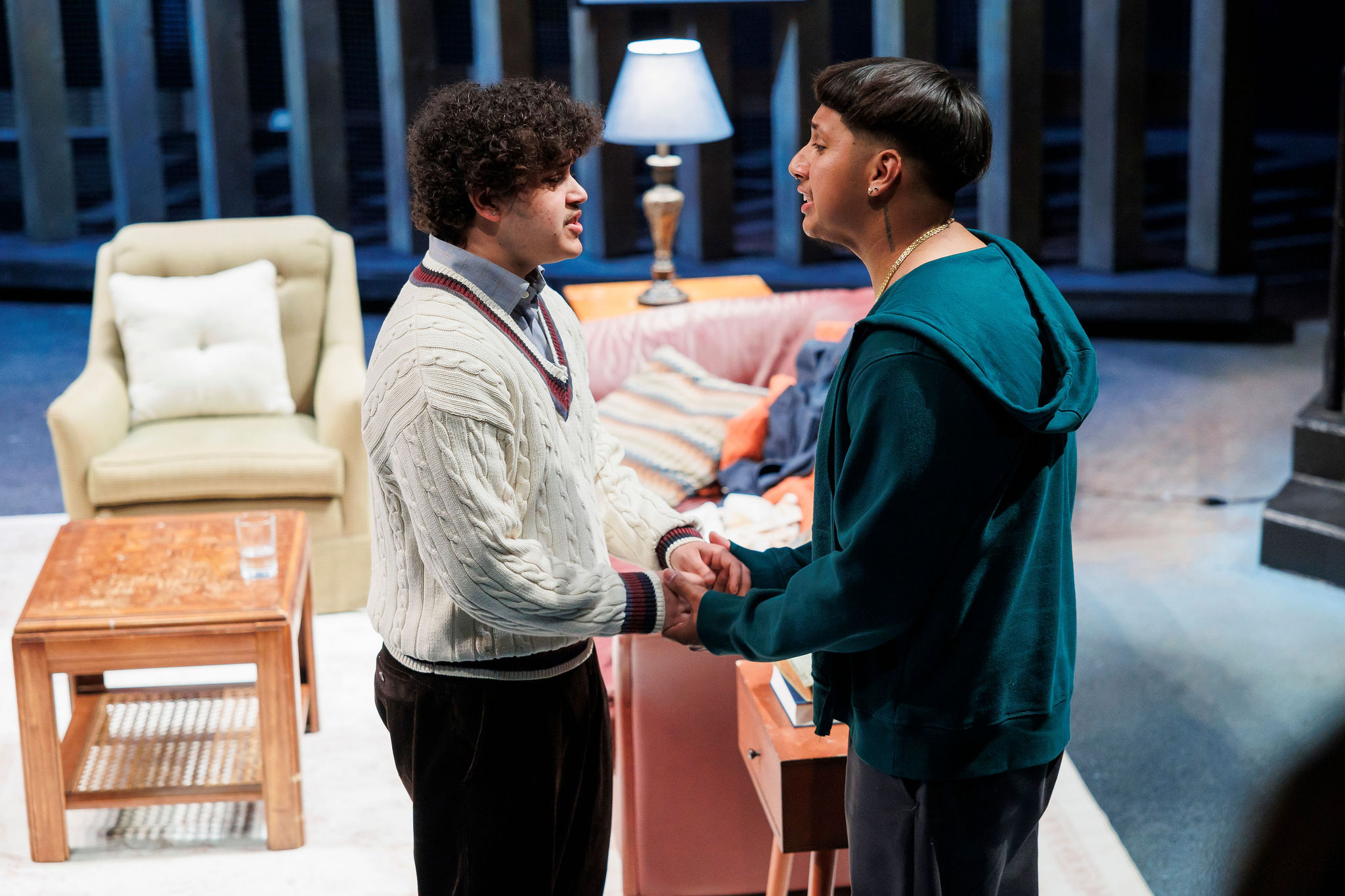 The goal of the set is to display the how the idea of America is both out of reach and yet it is still home to Dreamers. Therefore, this set features a large, looming wall in the background that also serves as an abstracted city. In act 2, the wall closes in and becomes the walls of a low-income apartment.